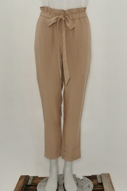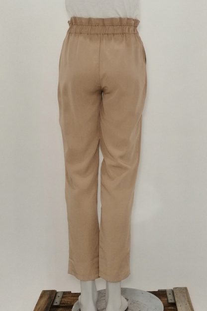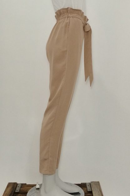 Pantalone veoma trendi boje sa učkurom i visokim pojasom. Model je u gornjem delu komotniji, dok se nogavice blago sužavaju. Imaju kose džepove na prednjoj strani. Materijal je jako prijatan i prirodan.