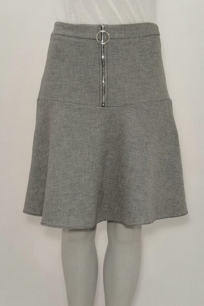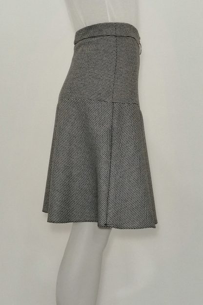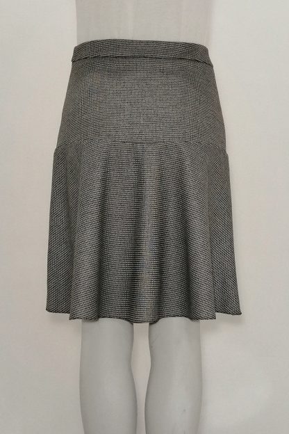 Dezenirana suknja dužine do kolena. Model ima ziper kao detalj sa prednje strane. Sečena je iznad bokova, odakle se širi celom dužinom. Suknja je u trendi crno beloj kombinaciji i idealna je za poslovne kombinacije.