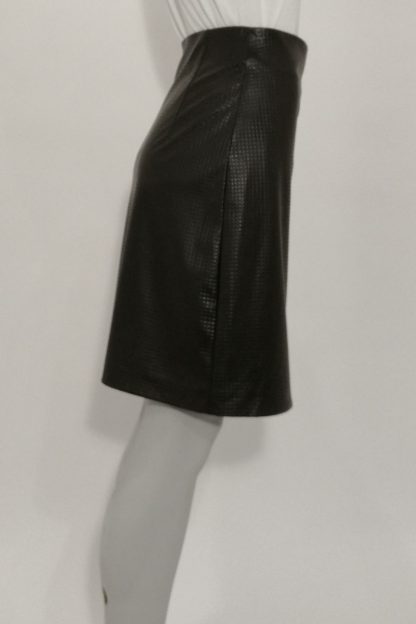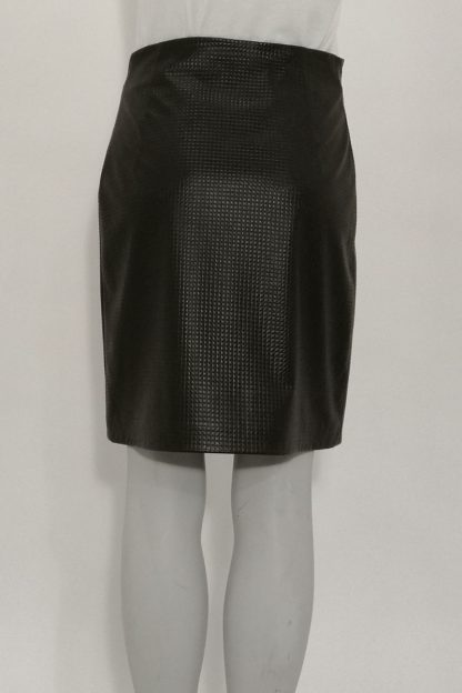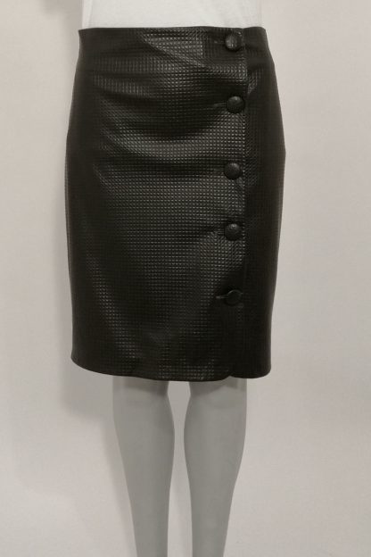 Ženska suknja na preklop, ravnog kroja do kolena. Napravljena je od reljefnog materijala, ima kopčanje na dugmad koja su napravljena od istog materijala. Veoma efektna suknja, kako za poslovni, tako i za casual stil.
