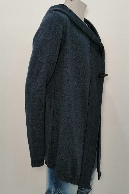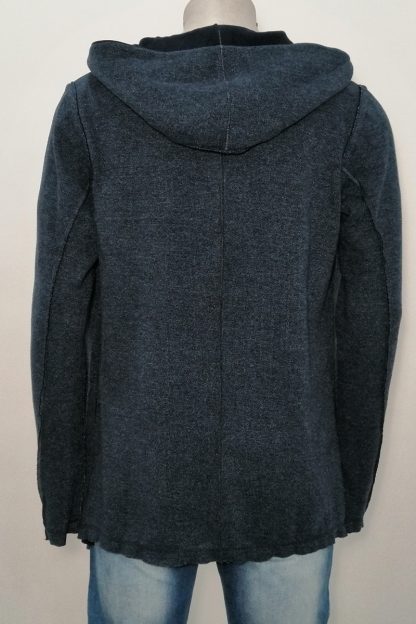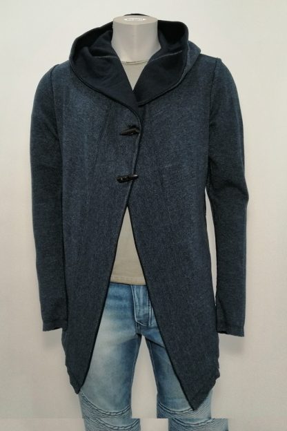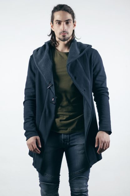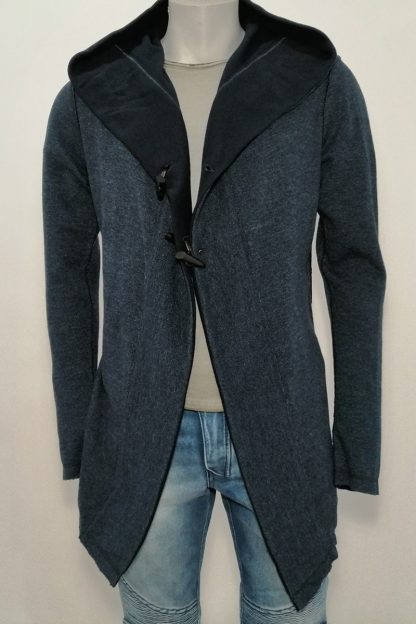 Muški kardigan sa dva lica i bogatom kapuljačom, za koji se može reći da predstavlja unikatan komad garderobe. Model je u kombinaciji dve boje ili dve nijanse iste boje, što daje mogućnost da izgledate drugačije jednostavnim menjanjem lica. Kardigan je asimetričan, sa prednje strane ima dva duža dela, koso šivena, dok je zadnji deo ravan i kraći. Zakopčava se sa dva drvena dugmeta.